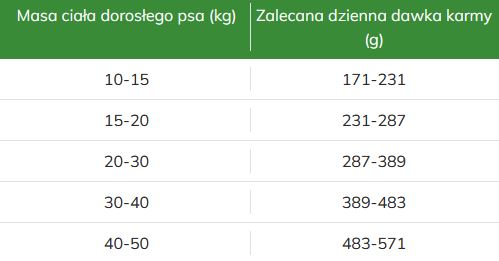 Dzienną porcję należy podzielić na 2-3 posiłki. Dostosuj dzienną ilość karmy do poziomu aktywności, kondycji fizycznej i indywidualnych potrzeb Twojego psa. Zalecane dzienne dawki karmy mogą ulec zmianie w zależności od indywidualnego zapotrzebowania psa. Ilość karmy należy zwiększyć o 10-15% w okresie zwiększonego wysiłku psa lub gdy zimą przebywa na zewnątrz.