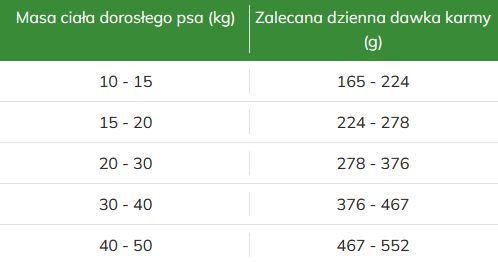 Dzienną porcję należy podzielić na 2-3 posiłki. Dostosuj dzienną ilość karmy do poziomu aktywności, kondycji fizycznej i indywidualnych potrzeb Twojego psa. Zalecane dzienne dawki karmy mogą ulec zmianie w zależności od indywidualnego zapotrzebowania psa. Ilość karmy należy zwiększyć o 10-15% w okresie zwiększonego wysiłku psa lub gdy zimą przebywa na zewnątrz.